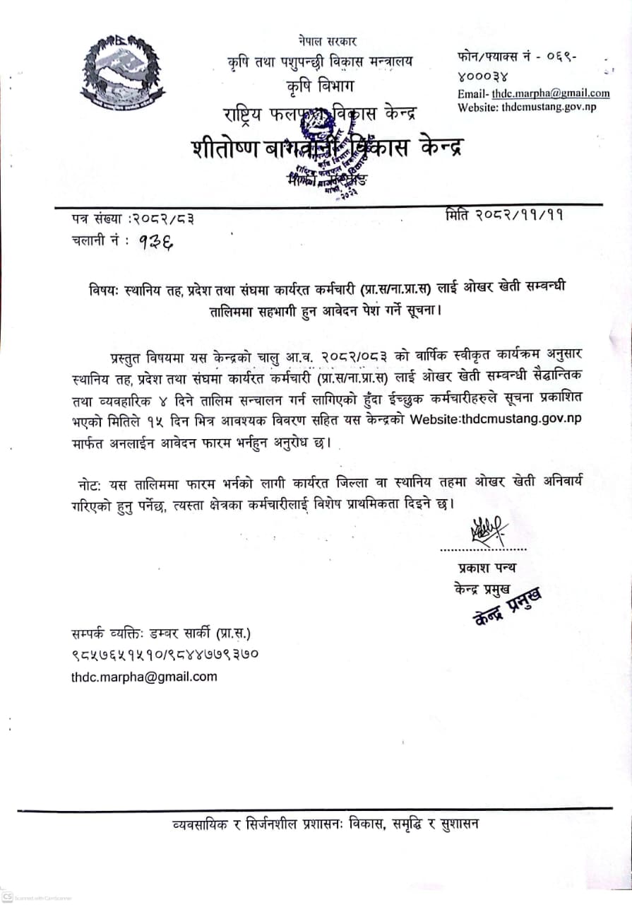 рд╕реНрдерд╛рдирд┐рдп рддрд╣, рдкреНрд░рджреЗрд╢ рддрдерд╛ рд╕рдВрдШрдорд╛ рдХрд╛рд░реНрдпрд░рдд рдХрд░реНрдордЪрд╛рд░реА(рдкреНрд░рд╛.рд╕/рдирд╛.рдкреНрд░рд╛.рд╕)рд▓рд╛рдЗ рдУрдЦрд░ рдЦреЗрддреА рд╕рдореНрдмрдиреНрдзрд┐ рддрд╛рд▓рд┐рдордорд╛ рд╕рд╣рднрд╛рдЧреА рд╣реБрди рдЖрд╡реЗрджрди рдкреЗрд╢ рдЧрд░реНрдиреЗ рд╕рдореНрдмрдиреНрдзрд┐ рд╕реВрдЪрдирд╛ 2082-11-11 2082-11-26