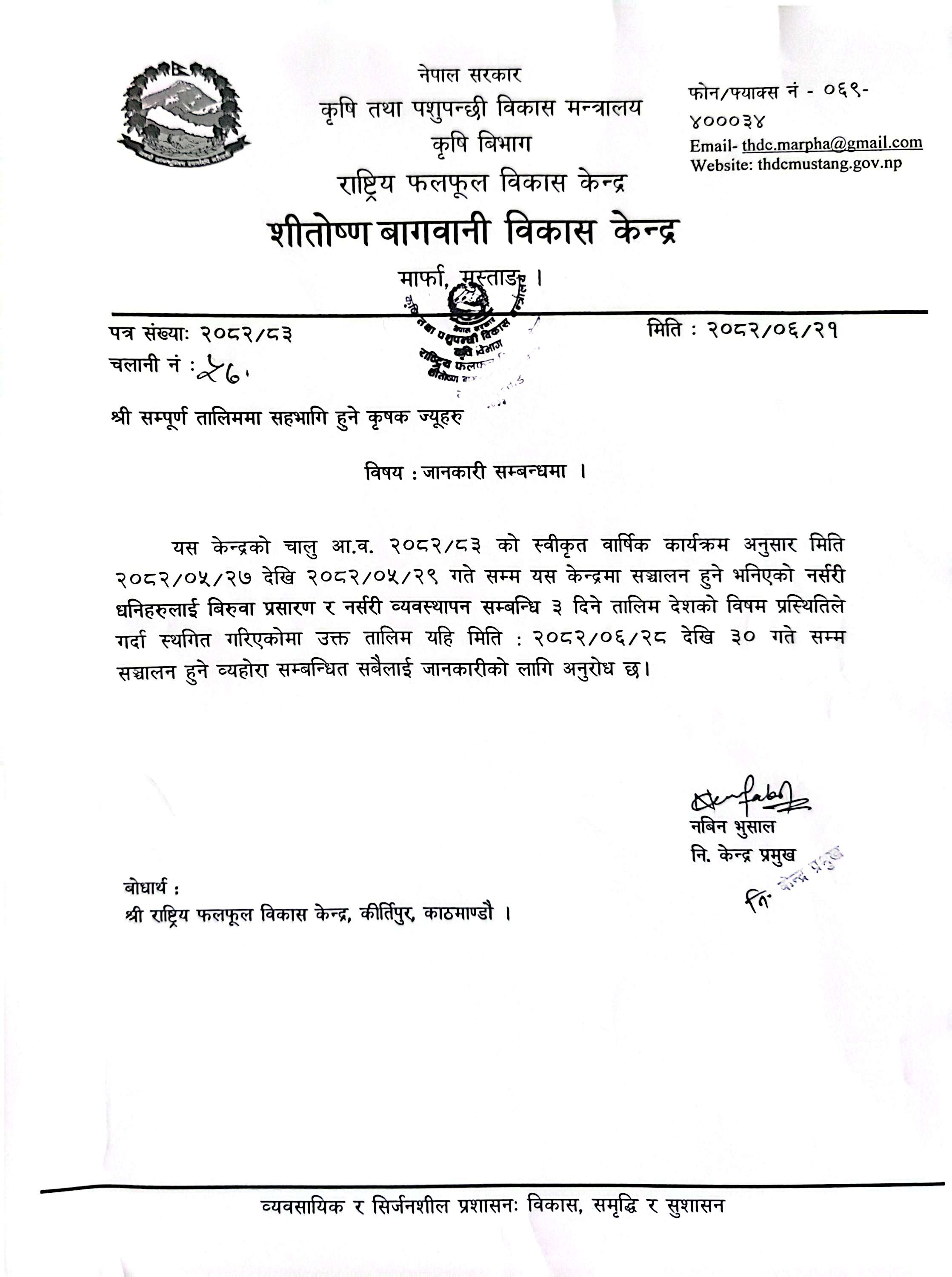 Temperate Horticulture Development Center Marpha, Mustang Contact No./ Fax: 069-400039 Email:┬аthdc.marpha@gmail.com