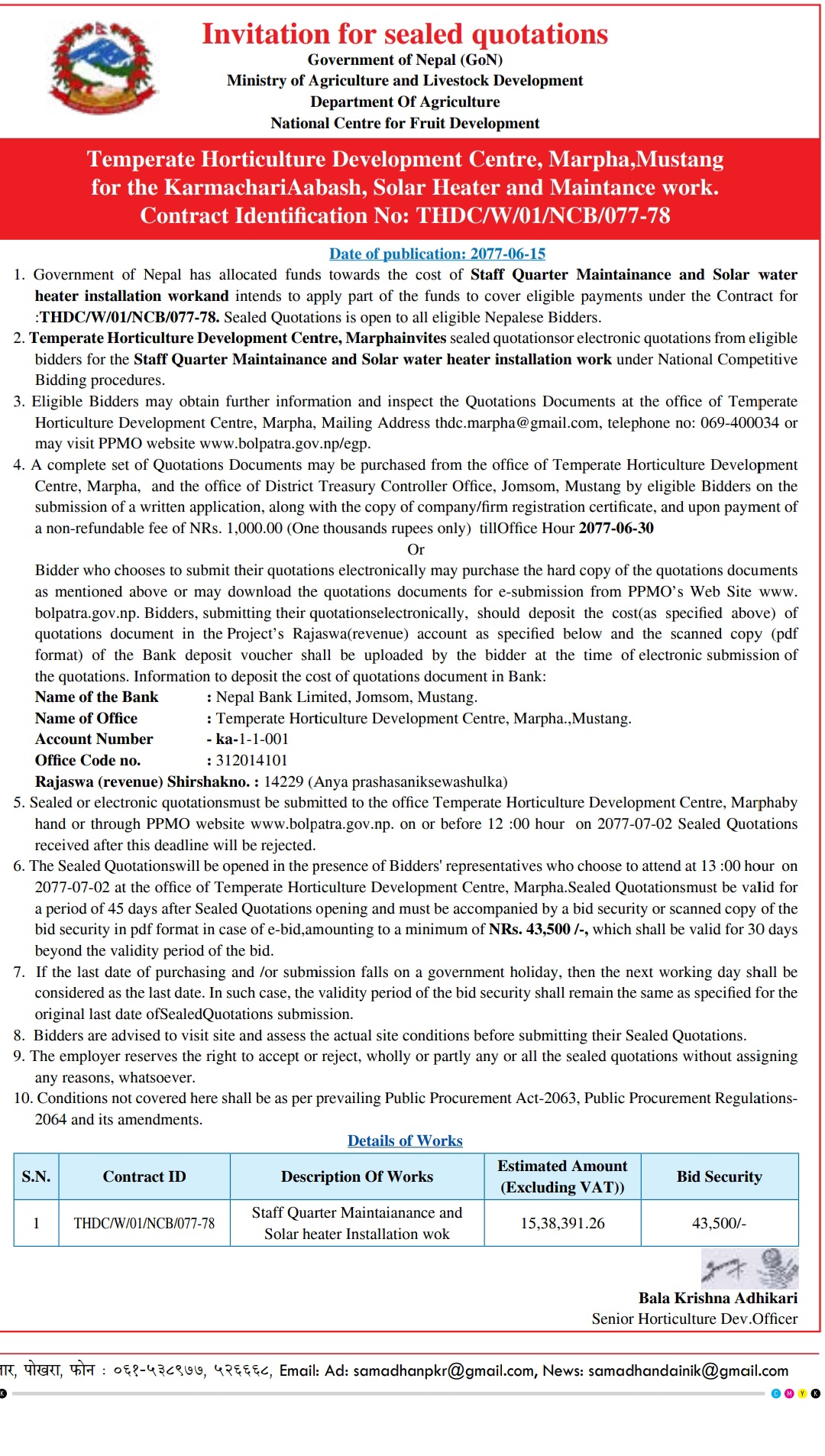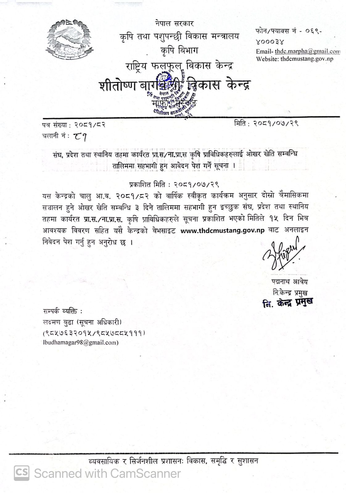 संघ, प्रदेश तथा स्थानिय तहमा कार्यरत प्रा.स/ना.प्रा.स कृषि प्राविधिकहरुलाई उच्च घनत्त्वमा स्याउ खेति र प्लान्ट प्रोपागेसन तथा नर्सरी व्यवस्थापन सम्वन्धि तालिममा सहभागी हुन आवेदन पेश गर्ने सूचना ।
